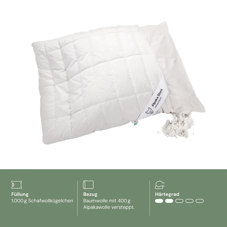 Für den ruhigen und gesunden Schlaf: Kuschelig weiches mit Alpakawolle verstepptes Kopfkissen, welches noch zusätzlich stützt. Gefüllt mit Schafwollkügelchen zur Stabilisierung des Kissens.